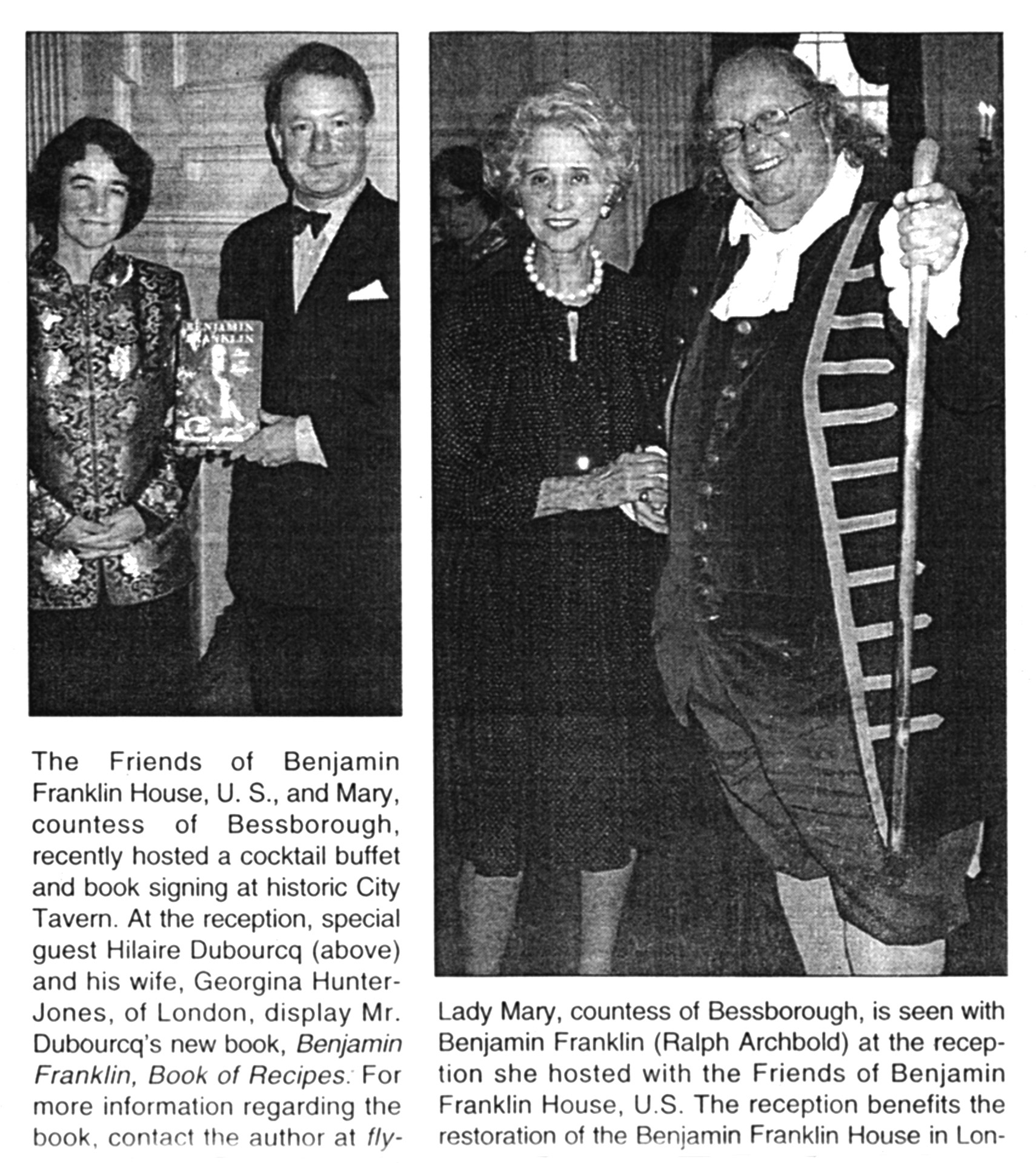 Benjamin Franklin Book of Recipes. Author: Hilaire Dubourcq. Hardcover. 192 pages. Published: 2004 Price: £11.99. Postage (UK): £3.00 For bulk orders or international postage please contact us. The Benjamin Franklin Book of Recipes" is a collection of recipes from the time of Benjamin Franklin, complemented by anecdotes about his extraordinary life in Boston and Philadelphia, London and Paris. Each chapter is set at a location where Franklin lived or was a visitor, and the menus reflect the food eaten at that time. The recipes are from several sources, including some by the great statesman himself. Among the period recipes and anecdotes, the reader will encounter some more modern recipes, and excursions into the origins of food and drink, all served with a liberal scattering of Franklin's quotations. Benjamin Franklin's wit and wisdom are present in all his writings, but never more so than when he is on a subject as close to his heart as food and drink. From the exceptional pains he took to discover the secret of Parmesan cheese, to his personal recipe for Milk Punch: "Take 6 Quarts of Brandy and the Rinds of 44 Lemons" - what he has to say reveals as much about his character and the society he was part of as it does about the food of his day. And in his diplomatic work in England and France the table was often the forum for patriotic battles on behalf of the United States of America which culminated in the Declaration of Independence and his recognition as a Founding Father of the United States. Benjamin Franklin - printer, scientist, philosopher, diplomat, and now cook? Perhaps, but whether your interest is in food or in Franklin you should find much to entertain you in this book. "This is a remarkable book. It is immensly entertaining, and contains material not to be found elsewhere. I will be unable to resist experimenting with a pupton of partridge, spinach soup with hot air crutons, and Newton Pippin upside-down. Try them for yourself, and enjoy this fascinating book". |